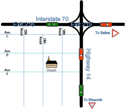 From the North: Take Hwy 14-South (exit 219 off I-70) to Ave. E. Turn right (west). Go 2 miles and turn right (north) onto 13th Rd. The church will be on your right.